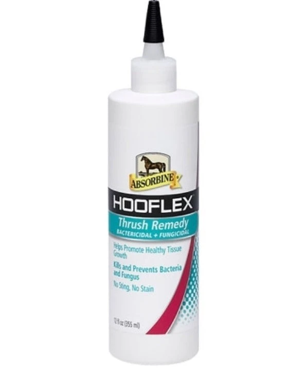 The Absorbine Hooflex Thrush Remedy Helps promote normal healing from thrush and white line disease. Easy-squeeze applicator is specially designed to reach deep into the frog where thrush organisms breed. Clear formula does not sting, stain or dry out hoof. Helps eliminate the odor associated with embedded bacteria and fungi. Does not contain formaldehyde. After cleaning the hoof, apply Thrush Remedy into clefts of frog and any holes or cracks.