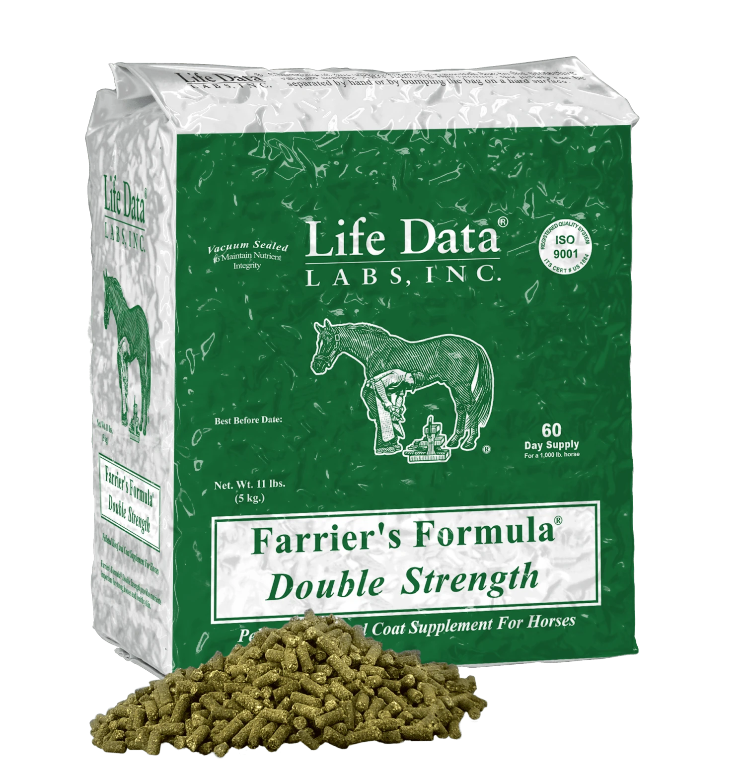 The nutrients in Farrier’s Formula Double Strength, important for a healthy hoof, are provided at twice the concentration to deliver twice the number of daily doses when compared to original Farrier’s Formula. Farrier’s Formula Double Strength provides nutrients such as phospholipids, omega fatty acids, and important amino acid protein to enable horses to build strong structural and connective tissue proteins that are important for healthy hoof structure and growth. Equates to a 60 day supply for a 1000 lb horse at the replenishment feeding level, or a 120 day supply at the maintenance level. Pellets