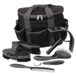 Convenient carry all bag with multiple pockets on outside, adjustable carry strap and zippered lid. Complete with 6 Great Grips grooming items: stiff bristle brush, flex finishing brush, tail, and mane brush, hoof pick, comb, and sweat scraper.