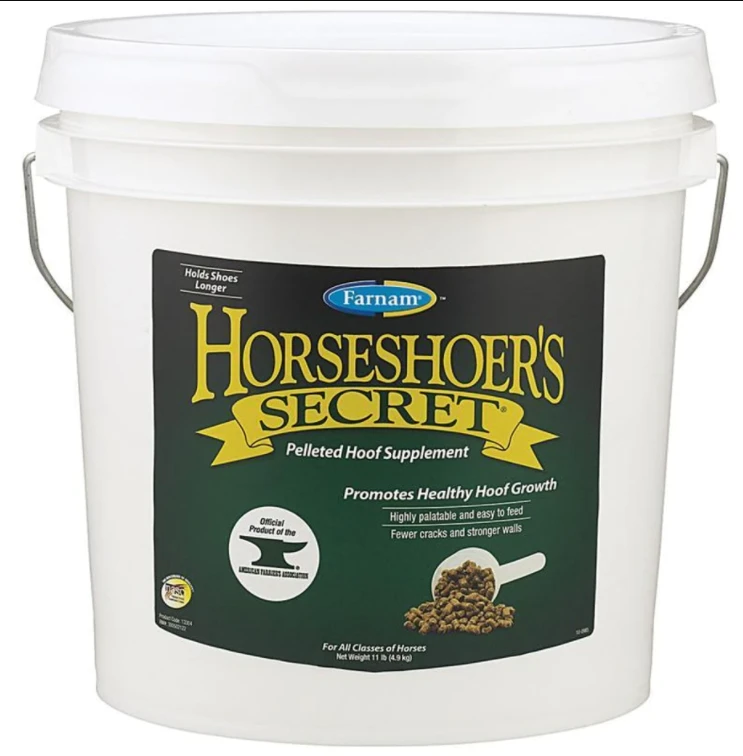 Horseshoer’s Secret Pelleted Hoof Supplement contains 15 mg biotin, 1704 mg lysine, and 2724 mg methionine per 6 oz. serving. Pellets.