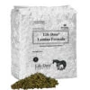 Dehydrated Alfalfa Meal, Soybean Meal, Ground Flaxseed (source of Omega-3), Maize Distiller’s Dried Grains with Solubles, Wheat Bran, Wheat Middlings, Dried Cane Molasses, Ground Corn Cobs, L-lysine, DL-methionine, Yeast Culture, Biotin, Calcium Carbonate, Copper Amino Acid Complex, Zinc Methionine Complex, Soybean Oil, Vegetable Oil, Bentonite, Lignin Sulfonate, Silicon Dioxide, Verxite Granules, Acetic Acid, Ammonium Hydroxide, Corn Starch, Dextrans, Tartaric Acid, Natural and Artificial Flavors; Benzoic Acid, Citric Acid, Butylated Hydroxyanisole (BHA), Butylated Hydroxytoluene (BHT), Propionic Acid, and Sorbic Acid (preservatives).