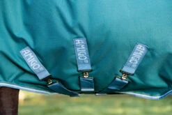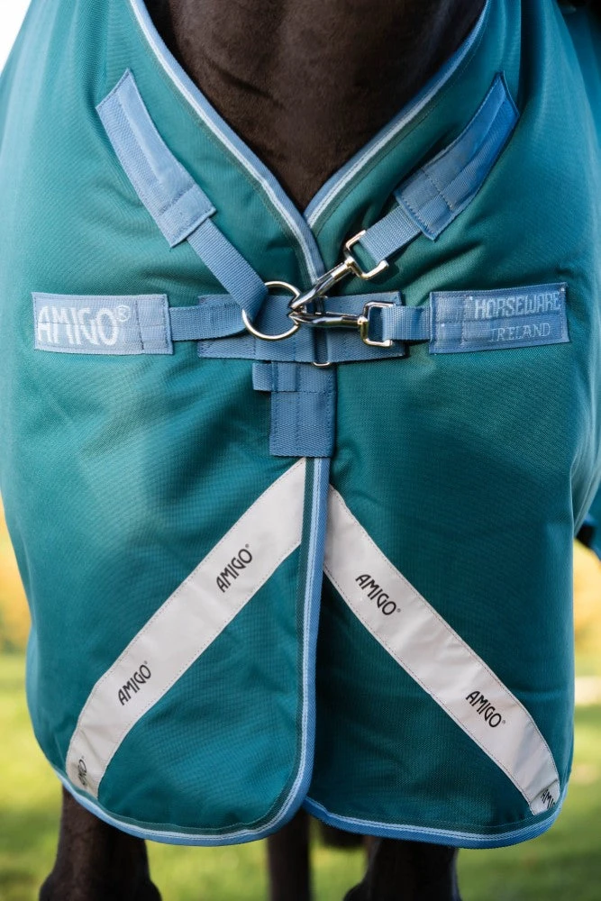 The Amigo ® Bravo 12 Plus Horse Turnout is a waterproof and breathable blanket. Made from a strong waterproof and breathable 1200D polyester outer, polyester lining and fiberfill inside for warmth. Now with our patented V-Front closure and cut to our surefit neck design, gorgeous colors. Incorporating our front and rear leg arches with 3 cross surcingles, shine enhancing polyester lining and a detachable hood.
