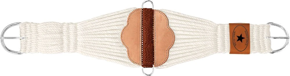27-Strand double woven white rayon cinch with billet pocket, wrapped nylon center and scalloped leather reinforced bars. Features 3″ nickel-plated straight pull buckles and 1″ nickel-plated dees.