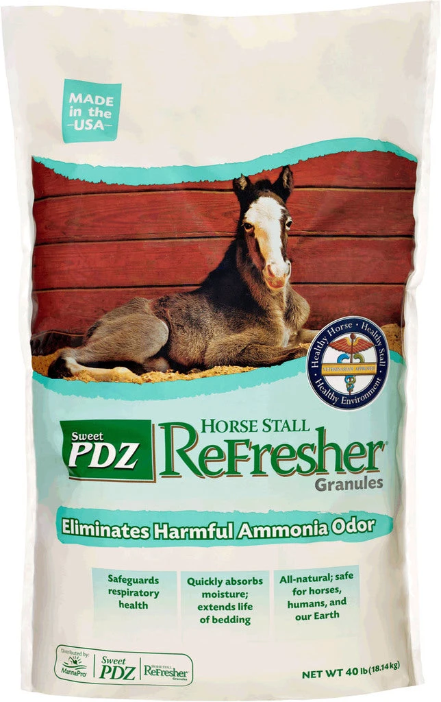 Sweet PDZ Horse Stall Refresher Granules remove ammonia from the air by absorption, dries as it deodorizes, and serves as a slow release nitrogen/potassium fertilizer. Unscented so it does not mask odors. OMRI-certified.