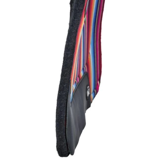 Add some colorful southwestern style under your saddle with this bright serape print saddle pad! The ¾” felt base provides superior wicking properties as well as great shock-absorption to keep your horse comfortable during tough workouts. Complete with a contour spine, smooth black wear leathers, and a wither relief opening.