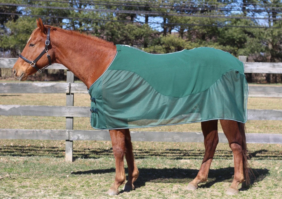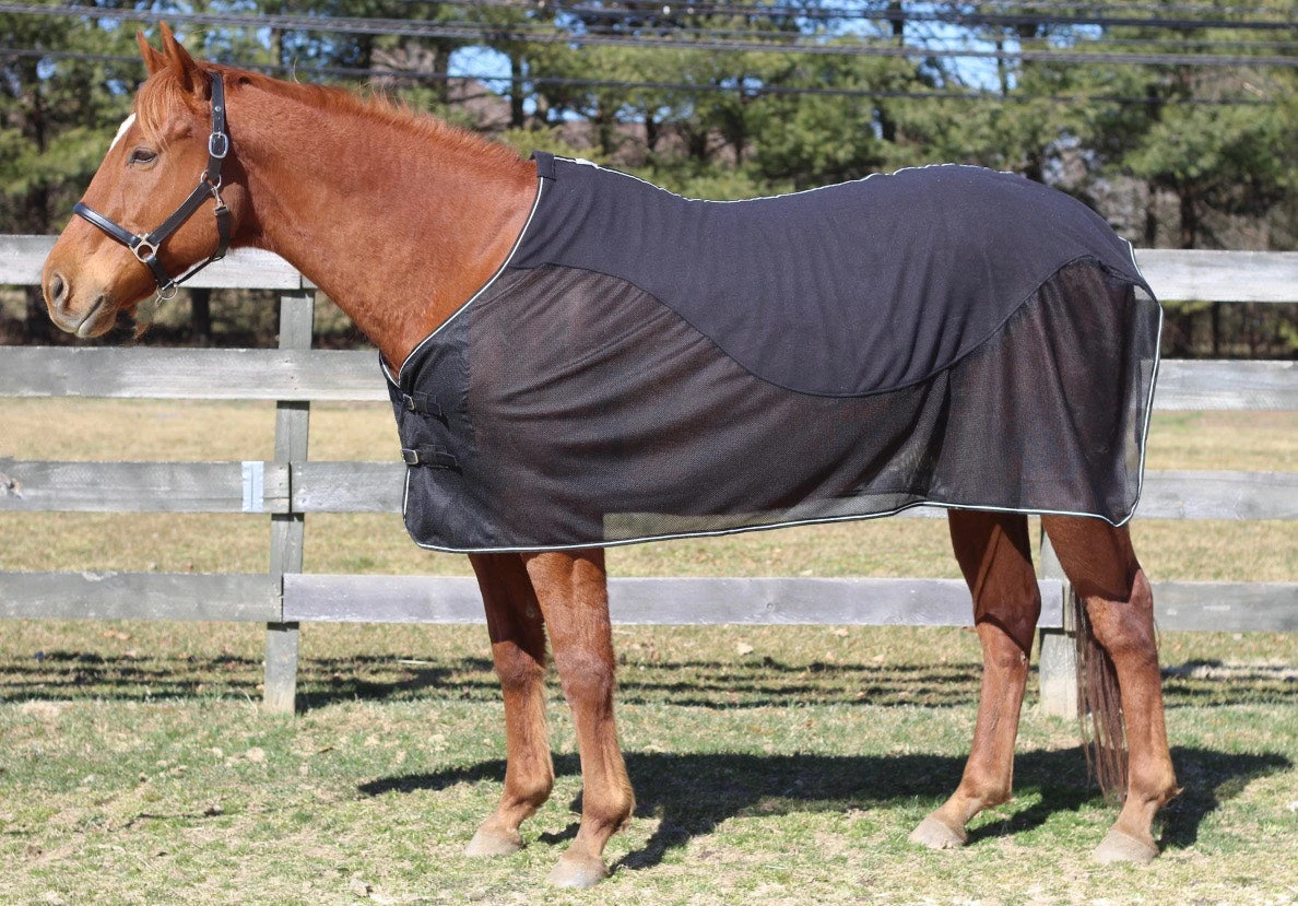 Need UV coverage, but with a little moisture removal from a spring morning ride? The TuffRider Air Mesh Cooler is a great combination of comfort and multiple functions. Fleece covers the back with moisture wicking capabilities while giving soft, no-rub action on the withers as many sheets do. Mesh fabric provides UV protection and adequate air flow for continued sweat removal and proper temperature regulation. Chest buckles and tail rope ensure your cooler will be secure for an easy cool down or ring-side hand grazing.